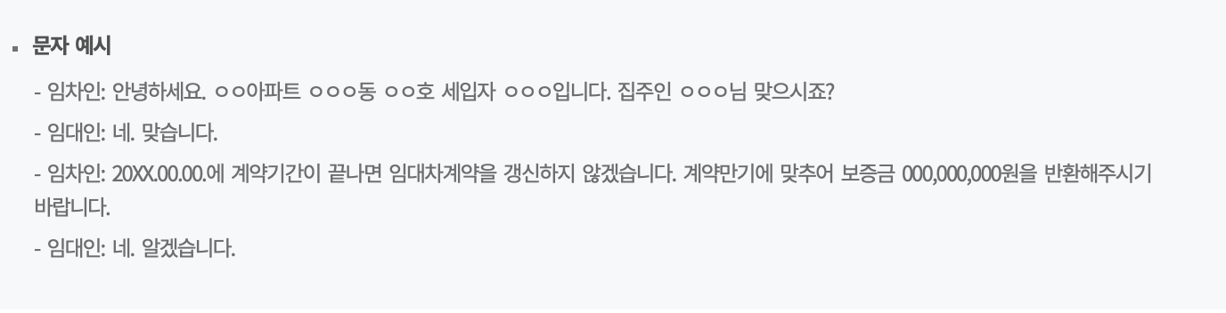 임대인에게 통보만 했다고 다 끝난게 아니에요, 임대인이 갱신거절 통보문자에 답장을 보낸날을 '갱신거절 통지가 완료된 날'로 본다고 하니 답장을 꼭 받아야합니다.